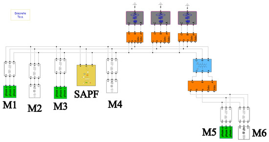 Figure 4 represents the equivalent model of the electric grid shown in Figure 1, in which the SAPF compensates three MV2 loads (M1, M2, and M3). Two assumptions can be made for the analysis: (i) the operating generators are represented as a single equivalent voltage source, and (ii) the circuit is represented in per-unit (p.u.); therefore, the transformer does not appear. Figure 5 shows the simplified model of Figure 4, where the current source represents the non-linear load, the constant impedances the linear loads, and the loads to be compensated (M1, M2, and M3) associated with SAPF. assumes different features depending on the control strategy (RLS or SCS) applied. The capacitor branch represents the typical shunt capacitor at the output terminals of SAPF.
