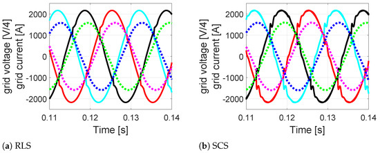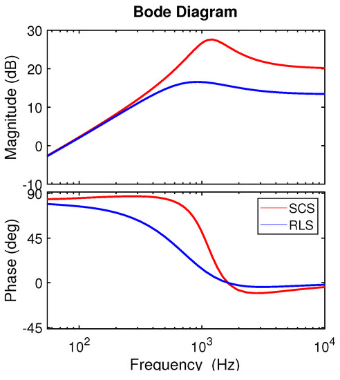 Figure 8 shows the Bode diagrams for both strategies using the values of Table 3. From Figure 8 one sees that the RLS strategy provided more damping effect for the harmonic currents than SCS, minimizing the voltage distortion [38]. The SCS strategy created non-linearity in the circuit, which may have amplified the value up to 10 times [39]. Therefore, the RLS showed better performance than the SCS.