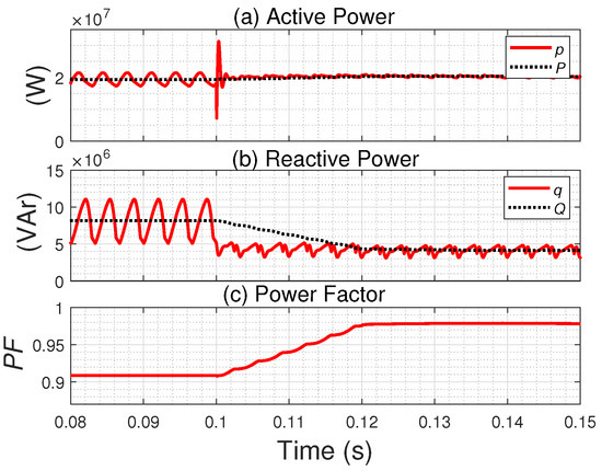 Figure 10 and Figure 11 show the waveforms corresponding to Case 3. Figure 10 shows the instantaneous (p) and the average active power (P), the instantaneous (q) and the average reactive power (Q), and the PF at PCC. As can be seen, the active power remained unchanged since the filter did not exchange active power with the grid; however, the reactive power at the PCC decreased when the SAPF operated (t = 0.1 s), increasing the PF. Figure 11 shows the grid current and voltage ( and ), and the SAPF current. As expected, when the SAPF operated, and became less distorted, which is quantified in Table 6.
