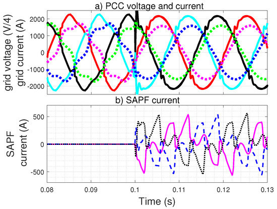 Such that k is a constant, and are the current and voltage at the SAPF PoC, as shown in Figure 5, and h is the harmonic order.