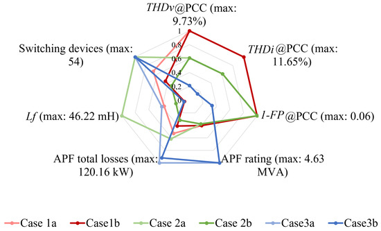 Figure 12 shows a summary of the different aspects considered in this study, proposed as a preliminary selection method to orient the choice of the SAPF. The parameters were normalized over their maximum value. Assuming they were weighted similarly, the smaller area delimited by the line corresponded to the case that was considered indicative of the better SAPF alternative. Table 7 shows the areas of Figure 12 for each case, in which 100% was the largest area.