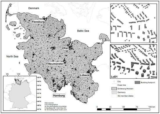 - Landesamt für Vermessung und Geoinformation Schleswig-Holstein. 3D-Gebäudemodelle: Level of Detail 1 (LoD1). Available online: https://www.schleswig-holstein.de/DE/Landesregierung/LVERMGEOSH/Service/serviceGeobasisdaten/geodatenService_Geobasisdaten_LoD.html (accessed on 23 November 2020).