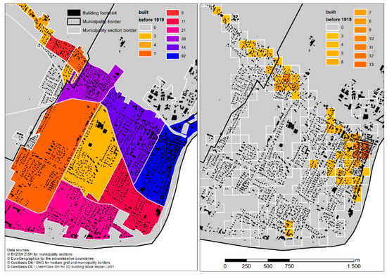 In the regional cadaster [55], the original address-based census results were aggregated by the regional statistics authority in 10 construction period classes for about 13,000 municipality sections representing most municipalities in the study area (Figure 2 left). Unfortunately, the cadaster did not cover the four major cities of the federal state (Kiel, Lübeck, Flensburg, Neumünster), since they have independent local departments for statistics, who did not participate in the cadaster project. Nevertheless, for this study it was possible to use the spatial information on the construction period for residential buildings for all other municipalities. Due to protection of data privacy, original information for some age classes in some municipality sections had been changed by the regional statistics authority via an algorithm. This was to ensure that a minimum of 3 residential buildings with the same construction period class were present or no information for this class is reported. In total, 9397 municipality sections contained information on the number of residential buildings per construction period.