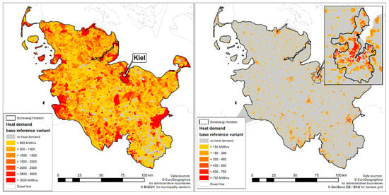 In 89% of the 12,876 municipality sections of the federal state (Figure 4 left), heated residential buildings were located and the annual heat demand could be modeled. On average, 1850 MWh per year are demanded by a municipality section. The maximum heat demand per section reached 112,106 MWh while the minimum was at 10 MWh per year. As mentioned above, for the four major cities no census data and therefore also no municipality section geometries were available in the provided cadaster data. Therefore, results were aggregated on the total municipality area for these cities. For the capital, the City of Kiel, a total residential building heat demand of 1,682,738 MWh per year was modeled (Table 2).
