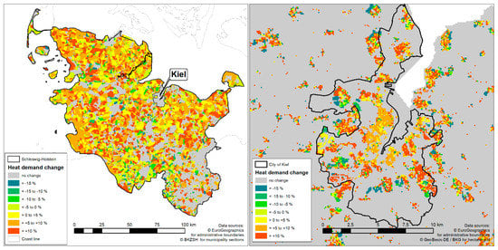 Heat demand density exceeds the threshold value of 150 MWh/(ha×a) now in just 60,962 grid cells, compared to 61,574 in the base reference results. This represents a decrease of 612 ha in the potentially suited area for district heating. Within the City of Kiel, 2890 hectares with a district heating potential are located (24% of the city area) that sum up to 1,657,030 MWh annual heat demand which is a share of 95% of the total residential building demand modeled for the city.