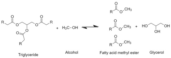 General scheme of the transesterification reaction of triglycerides with methanol.