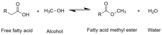 First, a triglyceride reacts with alcohol to give a molecule of fatty acid methyl ester and one of diglyceride. The latter reacts with another molecule of alcohol to generate another molecule of fatty acid methyl ester and a monoglyceride, which repeats the same procedure. Therefore, stoichiometrically requires a 3:1 molar ratio of alcohol to triglyceride to form three molecules of FAME and one of glycerol [38,39]. Commonly, transesterification reactions at the industrial level are carried out by a homogeneous catalyst with a strong basic character, such as NaOH and KOH. However, strong acids such as H2SO4 and HCl, enzymes like lipases, and heterogeneous catalysts can be used as well [40,41,42]. After the reaction, two phases are generated: the biodiesel (FAME) phase at the top and the glycerol phase at the bottom. This latter consists of a mixture of compounds present from the vegetable oil such as water, organic compounds which gave color and flavor to the oil, inorganic salts, alcohol, glycerides, and catalyst. Hence, after simple decantation, this by-product can be separated and then purified to be used as raw material for other processes. Free fatty acids (FFA) present in the oil can be transformed into esters by an esterification reaction in the presence of an acid catalyst such as H2SO4 (Figure 2).