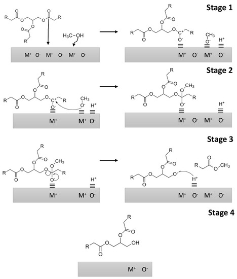 Diagram of the Langmuir-Hinshelwood reaction of a heterogeneous catalyst for the activation of the alcohol and transesterification of the triglyceride. M is the metallic site and O is the superficial oxygen [30,75].