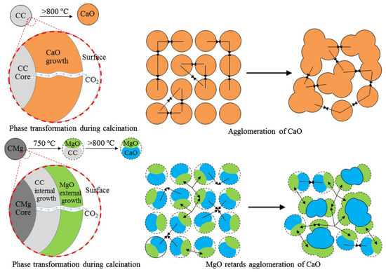Proposed model of the phase transformation for the thermal decomposition of calcite and dolomite. Reproduced with permission from [95]. Copyright Elsevier, 2018.
