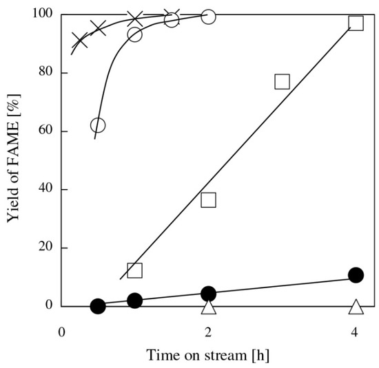 Yield of FAME for transesterification of soybean oil with methanol: (O) CaO; (□) Ca(OH)2; (Δ) CaCO3; (X) NaOH; (●) CaO-Air. Reproduced with permission from [99]. Copyright Elsevier, 2008.
