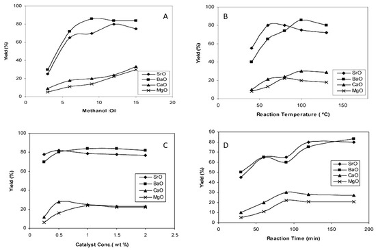 Comparison between the yield of FAME for transesterification of camelina oil with methanol using SrO, BaO, CaO and MgO: (A) effect of methanol/oil ratio, (B) effect of reaction temperature, (C) effect of catalyst concentration, (D) effect of reaction time. Reproduced with permission from [77]. Copyright American Chemical Society, 2009.