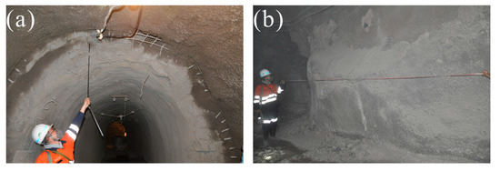 Field investigation. (a) Axial deformation measurement; (b) Radial deformation measurement.