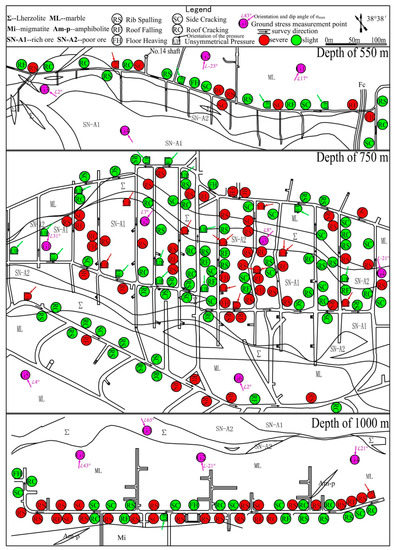 Shallow mineral resources are increasingly being depleted, so deep-well mining has become an important field of international mining production to meet the demand for social and economic development. There are more than 80 metal mines in the world with depths of over 1000 m, the deepest being more than 4000 m at the Mponeng gold mine in South Africa [1]. At greater depths, mining faces more complex engineering geological conditions, such as high geo-stress and fractured rock mass. Because of the poor conditions, the frequency and intensity of deep engineering disasters increase, threatening the safety of life and property [2]. It is important to study the deformation failure mode, failure characteristics, and roadway failure mechanisms at different depths to ensure safe and efficient production in the mining area [3,4].