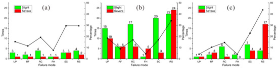 Times and percentage of various failure modes [21,22]. (a) Depth of 550 m; (b) Depth of 750 m; (c); Depth of 1000 m.