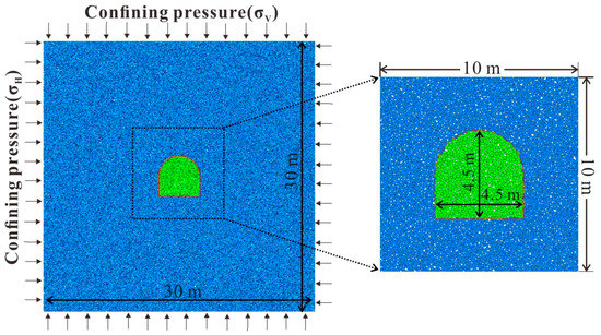 A model with a size of 30 × 30 m was constructed according to the roadway’s practical size, as shown in Figure 4. The excavated roadway was a semi-circular arch with a height of 4.5 m and a width of 4.5 m. There were 39,402 particles with a diameter of 6–10 cm created in the model.