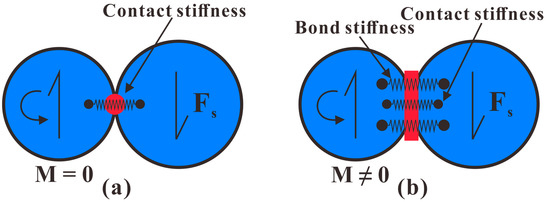 Two bonding models are available in PFC2D, including the contact bond model (CBM) and parallel bond model (PBM), as shown in Figure 5. The CBM is contacted by point and cannot transmit torque, while the PBM can not only transmit force, but also the torque, so the PBM is more suitable for the mechanical analysis of rock materials. When the tensile or shear stress exceeds the normal or tangential bonding strength, the bond breaks, and is gradually destroyed [26].