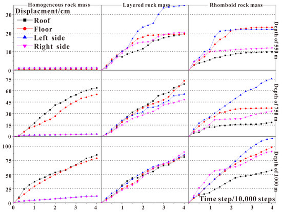 During the calculation of the models, the displacements on the roof, floor, and two sides of the roadways were recorded, and the curves obtained are shown in Figure 8.