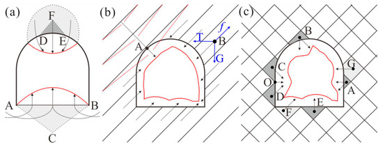 The deformation modes of roadway with homogeneous surrounding rock are mainly roof subsidence and floor heave, as shown in Figure 9a. Without the influence of the structural plane, the deformation of surrounding rock mainly depends on plastic flow. Roadway deformation starts from points A and B on the foot of the wall because stress concentration is more likely to occur at right angles [27]. With the development of the deformation, a triangular uplift area ACB is formed, and continuously develops at greater depths. At the same time, a wedge deformation zone DEF is formed on the roof and gradually squeezes into the goaf. Then, the deformation zone at the roof continues to extend upward to the surrounding rock, and the two sides also continue to expand, eventually forming an arch-shaped deformation zone.