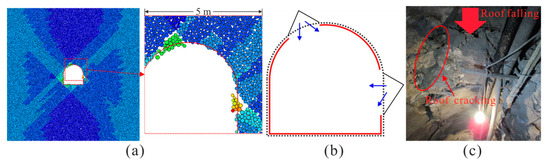 Roadway deformation failure with layered rock mass is mainly controlled by the structural plane, and the modes are various. In addition to the roof subsidence and floor heave, there are also special deformation failure modes such as side-wall extrusion, collapse, asymmetrical deformation, pointed roof, and irregular floor heave, as shown in Figure 9b. The starting point is usually located at the arch shoulder on the upper plate of the layer, shown as point A in the figure, where the surrounding rock is often bent and broken perpendicular to the layer, and then slides down to the goaf along the fracture, resulting in asymmetric deformation. With the continuous action of the stress, other positions of the roadway are deformed one after another. The stress of point B on the side includes gravity G in the vertical direction, extrusion pressure T from the deep surrounding rock, and friction f between the structural planes. When the resultant forces G and T along the structural plane are greater than f, the surrounding rock gradually slips toward the goaf. The deformation on the floor is also manifested by sliding along the structural plane, and the surrounding rock is cut into several sliding blocks by the structural plane. During the process of floor uplifting, multiple or partial floor heave usually occurs.