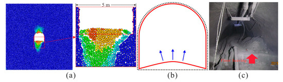 Schematic diagram of heaving floor failure. (a) Numerical simulation result; (b) Failure mechanism; (c) Field representation.
