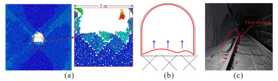 Schematic diagram of partial floor heave. (a) Numerical simulation result; (b) Failure mechanism; (c) Field representation.