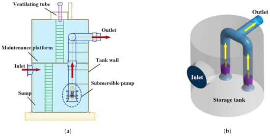 According to the relevant literature and the operation practice recommended by the manufacturer [27,28], the relationship between the effective volume of the storage tank and the flow rate of the prefabricated pumping station is V = Qb/4Zmax, where Qb is the pump flow and Zmax is the maximum number of starts and stops (10~30 times/hour). A Zmax value of 15 times/hour was used to match the relationship between the effective volume and the flow rate of the pump. The water body of the tank was selected as a cylinder with diameter and height of 1 m in the research. The design flow of each single pump was 198 m3/hour. The impeller diameter of the pump was 120 mm, the number of blades was 3, and the speed was 2400 rev/min. The two pumps were run at the same time.