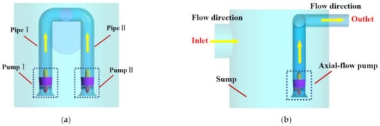 Figure 2 shows the structure of the prefabricated pumping station model. The numerical calculation area includes one collecting basin, one water inlet, two outlet pipes, and two symmetrical submersible axial-flow pumps. The pump includes an impeller, guide vane, and two submersible motors.
