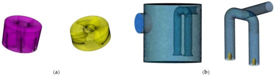 (a) Guide vane and impeller model grid; (b) Main body and pipe model grid of the sump.