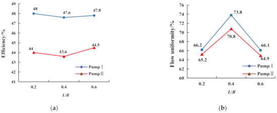 Figure 5b shows the variation curve of inlet velocity uniformity of the pump impeller chamber with L. According to the curve, when L = 0.4 R, the uniformity of the flow rate at the pump inlet was the highest. The uniformity of flow velocity at the inlet of Pump I was 1~4% higher than that of Pump II.