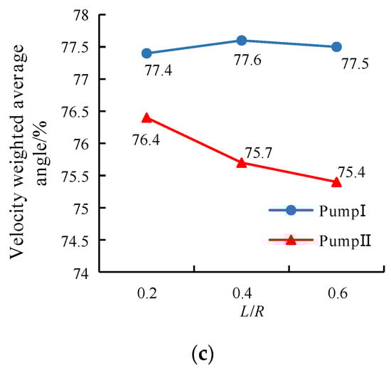 Figure 5c shows the curve of the weighted average angle of inlet velocity of the pump impeller chamber with L. It can be seen from the curve that the inlet velocity weighted average angle of the Pump I impeller chamber increased slowly with increasing L. However, the weighted average angle of the impeller chamber inlet velocity of Pump II showed a gradual downward trend with increasing L. The weighted average angle of inlet velocity of Pump I was higher than that of Pump II.