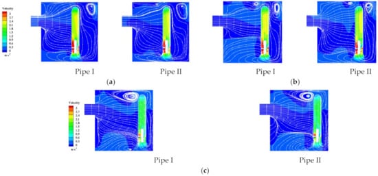 It can be seen from Figure 11; Figure 12 that the two swirling currents converged in front of the two pumps. With increasing S, the rotation radius of the streamline increased gradually around the pipe. This made the streamline between the two pipes tend to be uniform and smooth. When S = 0.6 R, smaller vortices appeared in the lower area of the suction inlet of the two pumps, but the vortex disappeared at the suction section. At this time, the streamline and velocity distribution were symmetrical. For both S = 0.8 R and S = 1.0 R, an obvious vortex appeared in the sump near Pump II. This led to deterioration of the flow pattern near Pump II, and the efficiency of water Pump II was reduced. The distribution of the side streamline and velocity near the incoming direction was not uniform.
