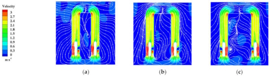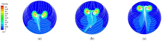 Streamline and velocity nephogram of Section 3-3 of the sump under different S values: (a) S = 0.6 R; (b) S = 0.8 R; (c) S = 1.0 R.
