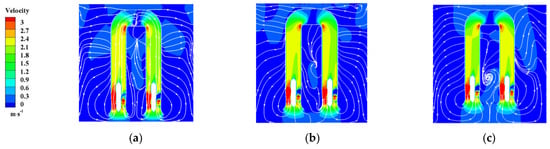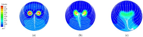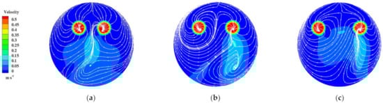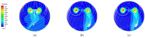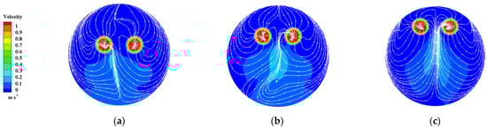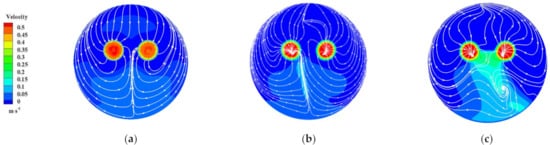 Streamline and velocity nephogram of Section 4-4 of the sump under different S values: (a) S = 0.6 R; (b) S = 0.8 R; (c) S = 1.0 R.
