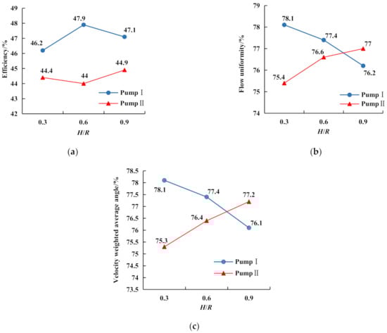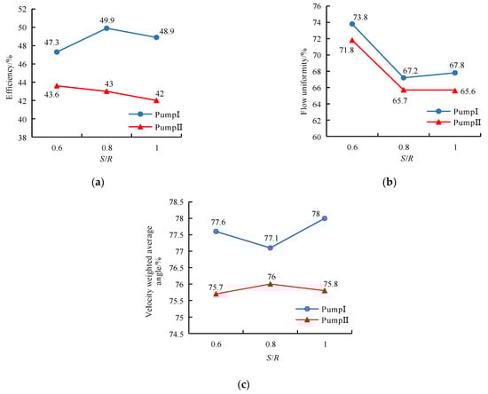Figure 9a shows the curve of the influence of S on the efficiency of the two pumps. According to the curve, the efficiency of Pump I was higher than that of Pump II. The efficiency of Pump I was the highest when S = 0.8 R, and the efficiency of Pump II decreased with increasing S.
