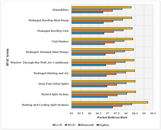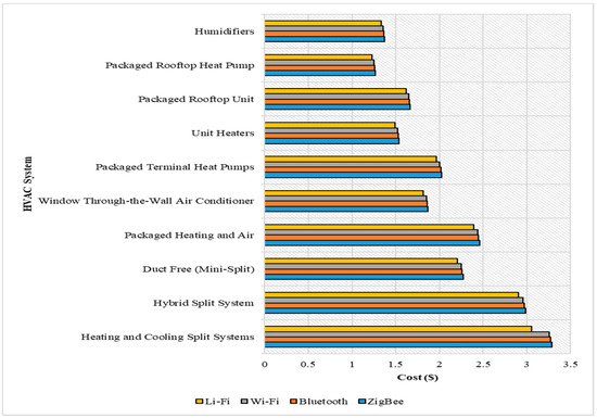 In this section, various HVAC devices are used to find the effectiveness of the proposed method that includes Heating and Cooling Split Systems, Hybrid Split System, Duct Free (Mini-Split), Packaged Heating and Air, Window Through-the-Wall Air Conditioner, Packaged Terminal Heat Pumps, Unit Heaters, Packaged Rooftop Unit, Packaged Rooftop Heat Pump and Humidifiers. The proposed method is compared with other existing methods that include RNN [43,44,45,46], ANN [39,46] and CNN [47,48,49,50] algorithms and with other communications protocols, including Li-Fi, Wi-Fi, Zigbee and Bluetooth. The datasets are collected from large size units, as in [51], and the simulations are conducted in a python anaconda complier with 16GB RAM usage requirements.