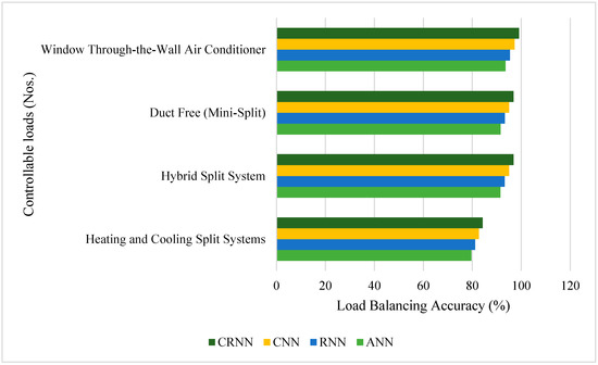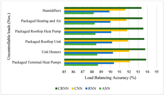 Figure 9 shows improved load balancing accuracy on uncontrollable loads (Packaged Terminal Heat Pumps, Unit Heaters, Packaged Rooftop Unit and Packaged Rooftop Heat Pump and Humidifiers) by Li-Fi technology for smart commercial three-storied buildings with multiple HVAC devices over the RNN [43,44,45,46], ANN [39,46] and CNN [40,47,48,49,50] algorithms. The results show that an increased number of counts for single device lags the stability due to the reduced load balancing accuracy compared to those with fewer device counts. Figure 9 shows an improved load balancing accuracy by the CRNN method for a smart building with multiple devices over the ANN, CNN and RNN algorithms. Further, it shows that an increasing number of homes tend to reduce their load balancing accuracy, and it further reduces the reduced bandwidth in the communication protocol used.