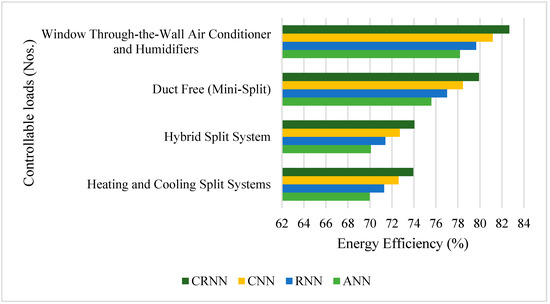 Energy efficiency (%) over various deep learning algorithms with controllable loads.
