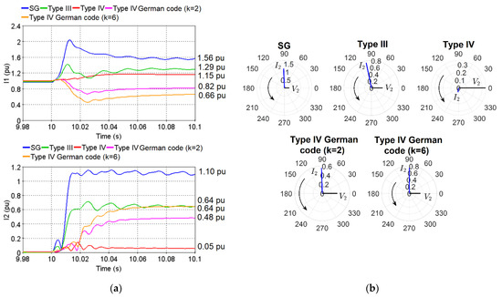 Figure 1. (a) Comparison of the amplitude of I1 and I2 of a SG, a Type III-, and a Type IV-based inverter-based resources (IBR) under the German grid code with various values of characteristic proportional gain k; (b) Phasor of V2 and I2 of a SG, a Type III-, and a Type IV-based IBR under the German grid code with various values of characteristic proportional gain k. - Fault sequence quantities: The inverter fault current does not include zero-sequence component (although zero-sequence current may still flow at the terminals of an IBR when connection to earth is provided by a transformer with a high-side, wye-grounded winding.) Further, I2 is typically partially or entirely suppressed depending on the inverter control [1]. Figure 1a shows that the I2 of a Type IV IBR is close to zero due to the nature of the traditional inverter coupled control scheme [3]. This lack of I2 may lead to protection misoperation problems, and hence grid codes have recently added requirements for IBR I2 injection during unbalanced faults. An example is the German grid code [28] which requires IBRs to inject a reactive I2 based on the characteristic curve of Figure 2 defined by a characteristic proportional gain k with a recommended value between 2 and 6. Figure 1a shows the impact of k = {2, 6} on the fault response of the Type IV IBR. As shown, I2 increases with the increased gain; nevertheless, I1 decreases since the total amplitude of the converter current is limited.