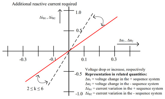 Figure 2. Characteristic curve for IBR I2 injection based on the German grid code [28]. - Fault current power factor/phase angle: The fault current of an IBR has a dynamically changing phase angle depending on IBR control scheme and the amplitude of inverter terminal voltage, as shown in Table 1 [29]. Further, in contrast to a SG whose fault current is predominantly inductive, the fault current of an IBR may be either resistive, inductive, or capacitive. The control mode considerably impacts the angular relationship between on-fault voltages and currents near the IBR which is required by some protection functions (e.g., directional elements) for correct operation. Figure 1b compares the relative phase angle of I2 and negative-sequence voltage (V2) for a SG, a Type III-, and a Type IV-based IBR. As shown, for the SG and Type III IBR, I2 is predominantly inductive (i.e., I2 injected by the generator into the grid leads V2 by about 90°). However, the behavior is different under Type IV where I2 is predominantly capacitive (lagging V2 by about 90°). This changed angular characteristics may lead to misoperation of protection functions relying on the phase angle of I2/V2 for proper operation. The paper provides examples of such misoperation problems. This could be addressed by reactive I2 injection, e.g., based on the German grid code, in which case the phase angle becomes predominantly inductive, as shown in Figure 1b for k = {2, 6}.