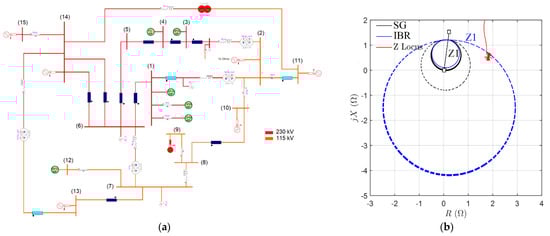 (a) The 230/115 kV test system and (b) comparison of dynamic expansion of a memory-polarized distance mho circle under synchronous generators (SG) and IBR.