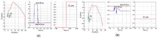 Figure 4a,b show the response of the distance relay in Scenario 1 and Scenario 2, respectively. As shown, in Scenario 1 with a strong grid the apparent fault impedance trajectory enters zone 2, the measured fault current If = 4.56 pu is above the pickup threshold of Ipkp = 0.5 pu, and zone 2 successfully picks up and instantaneously issues Z2_pkp signal. By contrast, in Scenario 2 with IBR, the measured fault current becomes If = 0.46 pu which is below the pickup threshold, the supervising overcurrent element does not pick up, and the zone 2 distance element fails to pick up. The cause of this misoperation is lack of enough supervising current due to the low amplitude of the fault current contribution of the WP on bus (4).