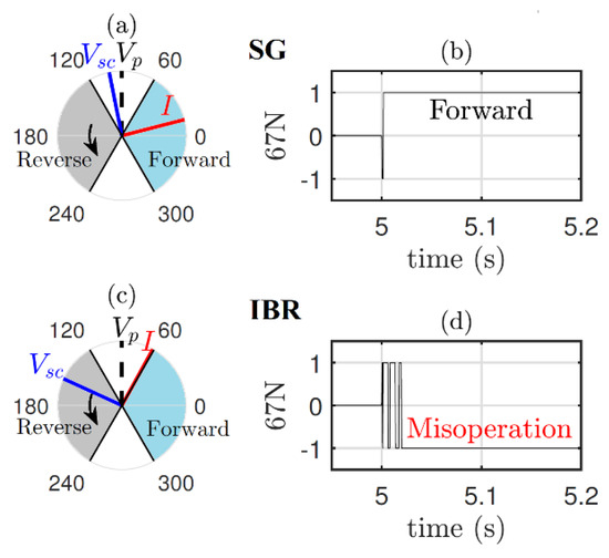 Figure 5a,b show the phasor diagram and response of the 67N forward element under SG. As shown, subsequent to the fault, the on-fault voltage deviates from the polarizing voltage only by about 11°, the short-circuit current lagging by about 90° falls within the forward zone, and the 67N element successfully declares forward direction. Figure 5c,d show the response under IBR. As shown, in contrast to the previous case, exhibits a significant phase shift of about 65° with respect to , the short-circuit current lagging by about 90° falls outside the forward zone, and the 67N element fails to declare forward direction. The cause of this misoperation is the larger shift of with respect to due to the faster control response time of WPs.