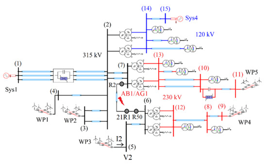 To illustrate this misoperation, a simulation study has been conducted on a 230/115 kV multi wind park (WP) test system shown in Figure 3a. The model represents a portion of an actual North American transmission system. A distance relay on bus (1) protects the line connecting bus (1) to bus (2). The relay uses a memory-polarized mho circle characteristic. A mid-line phase-A-to-ground fault with a fault resistance of Rf = 1.6 Ω (equivalent to 20 Ω on the primary side of current transformer (CT) and voltage transformer (VT)) has been applied on the protected line. The mho element of the line distance relay uses cross polarization with a memory duration of 0.2 s providing an initial resistive reach of approximately 1 Ω when the source impedance behind the relay is characterized by a strong system. Given that this initial resistive reach is smaller than the fault resistance, successful distance relay operation means that zone 1 should not pick up. The fault has been simulated under two scenarios: (i) Scenario 1 in which the corridor connecting bus (1) to bus (6) is closed and the impedance behind the relay is characterized by a strong connection; and (ii) Scenario 2 in which the corridor is open, e.g., due to a scheduled maintenance, and hence the impedance is characterized by the dynamically changing source impedance of the three WPs connected to bus (1). The simulation test has been conducted within the EMTP software environment [33] using a generic EMT model of a wind generator [34].