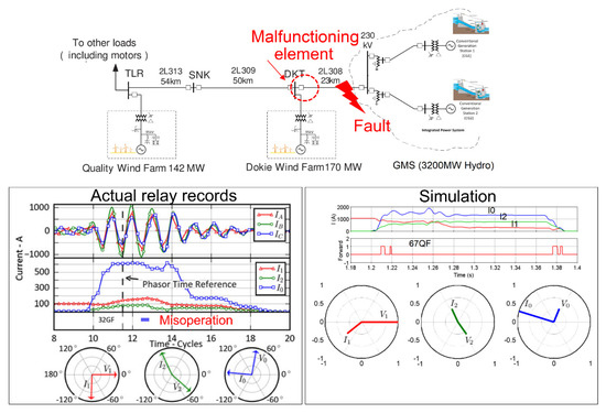 An example of such a misoperation is the 2014 event in a north American transmission system where a directional negative sequence overcurrent element failed to correctly identify the direction of a fault near a Type III WTG [26]. The reference has shown that use of POTT scheme with zero-sequence and echo logic fixes the misoperation. Figure 8 shows the system, fault records, and simulation of the event in EMTP. The system voltage is 230 kV. There are three WPs, namely Quality which is a Type III-based WP and Dokie which consists of two Type III-based WPs. A transmission line denoted by 2L308 connects the WPs to a hydro station. A relay in the DKT substation uses a directional negative sequence element looking towards line 2L308. A phase-B-to-ground fault 9.5-km from DKT substation occurred evolving into a phase-B-to-C-to-ground fault after three cycles. The fault was in the forward direction of the relay, but the forward element did not assert. Figure 8 shows the actual relay records and simulation results. The current and voltage phasors in all cases have been obtained two cycles into the BG fault. As shown, the forward element only asserts transiently since I2 leads V2 by a phase angle close to 180° which corresponds to the reverse zone. The cause is the resistive I2 contribution of the WPs. The results show an agreement between the recorded and simulated phase angle of voltage and current phasors. The discrepancy in the amplitude of sequence currents is due to modeling differences and unavailability of the full data of the system.