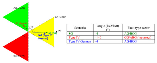 To illustrate this impact, fault AG1 is applied in the test system of Figure 6, and a distance relay denoted by 21R1 on bus (6) is used to detect the faulted phase. Figure 10 shows a graphical representation of the FID logic which uses the three colored sectors and the respective phase angle of IA2 to IA0 to classify a fault [40]. Assuming the phase angle of IA0 vector to be the reference, the fault is classified as {AG/BCG}, {CG/ABG}, or {BG/ACG} when IA2 vector falls within the yellow, green, or red sector, respectively. Three generation scenarios have been considered where the generators are: (i) SGs; (ii) Type IV-based IBRs with no I2 control; and (iii) Type IV-based IBRs with I2 control based on the German grid code with k = 2. As shown, under SG IA2 lags IA0 by about −4° which falls within the AG sector, and the FID successfully declares an AG fault. Under Type IV IBR with no I2 control, IA2 leads IA0 by about −140° which falls within the CG sector, and the FID scheme mistakenly declares a CG fault. The cause of this incorrect fault identification is the changed phase angle of I2 due to the Type IV IBRs. Under Type IV German, IA2 lags IA0 by about −4° which is within the AG sector, and the scheme successfully declares an AG fault.