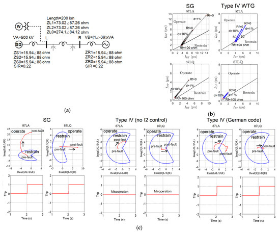 To demonstrate the effect, two simulation tests have been conducted to study the performance of an Alpha Plane LCD and a traditional LCD in the 500-kV two-source test system of Figure 11a. The LCD scheme protects the line connecting bus L to bus R. The source on bus R is a Thevenin equivalent representing a SG-dominated power system. The source on bus L represents three generation scenarios: (i) SG; (ii) type IV-based IBR with no I2 control; or (iii) Type IV-based IBR with I2 control.