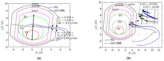 - PSB function: The increased rate of change of swing impedance vector may cause PSB to mistakenly interpret a power as a system fault and fail to declare a power swing condition. A potential solution is to reduce the time delay setting of the PSB function by finding the fastest swing in presence of IBRs. Figure 13a illustrates this misoperation by comparing the simulated swing impedance trajectory simulated under a SG-dominated power system and under 25% IBR integration. The PSB function measures the rate of change of impedance using an outer and a middle characteristic and a time delay setting of three cycles. Under SG, the swing crosses the outer and middle elements at = 5.154 s and = 5.213 s, respectively, corresponding to a time delay of 3.5 cycles. Since this time delay is larger than the PSB setting of 3 cycles, the function successfully detects the power swing and blocks the corresponding zone elements of the supervised distance relay. However, under 25% IBR the swing crosses the outer and middle elements at = 5.128 s and = 5.173 s, respectively, corresponding to a time delay of 2.7 cycles which is less than the PSB time delay setting. Consequently, the function fails to detect the swing, the impedance trajectory enters zone 2, and the distance relay unintentionally declares a fault on a healthy line. The cause of this misoperation is the higher rate of change of swing impedance caused by reduced inertia under IBR. To eliminate such a PSB misoperation, a solution is to reduce the PSB time delay. A limitation of this solution is that reducing the PSB time delay to very small values may lead to unwanted blocking of distance relay zones by the PSB function during a fault.