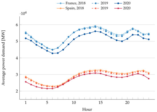 Comparison of the total daily average demand [MW] for 2018, 2019, and 2020 in France and Spain.
