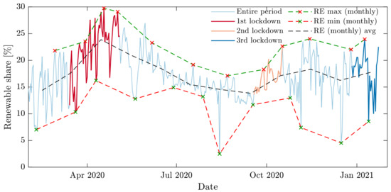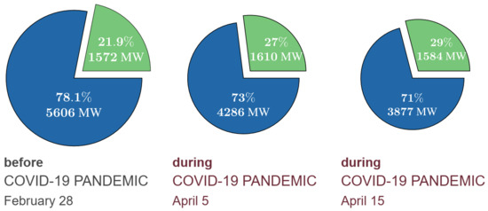 The reduced electricity consumption observed during the pandemic is mainly the result of government measures against the virus spread. In general, when policies to mitigate the pandemic became more severe, the consumption of electricity decreased. Two examples are shown in Figure 1 and Table 4. Figure 1 shows an example of the total daily average demand [MW] in France and Spain in 2018–2020. As can be seen in the figure, the demand in 2020 was considerably lower than in previous years. Table 4 presents the total energy demand and the maximum power demand in Israel during the nine–six weeks before, during and after the first lockdown (March–May 2020) and three weeks before and during the second lockdown (September–October 2020). The table shows that during the first and second lockdowns in Israel there was a decrease in both the energy and the maximum power demand and that as measurements got more severe during both lockdowns, demand further decreased. Moreover, we may clearly see that the measured metrics returned to their normal values as before the lockdown, indicating that the system recovered once governmental measures were relaxed. One direct result of the reduced consumption is an increased relative share of renewable sources in the energy mix. A possible explanation for this effect is that renewable sources are often prioritized over conventional power plants, and as a result their relative share increases when the consumption is low [12]. These phenomena can be seen in Figure 2, which presents the relative share of renewable energy in Israel in each of its lockdowns during 2020. As can be seen, the share of renewable energy increased during all three lockdowns. An exception to this trend is the third lockdown, in which the renewable share decreased towards its end, probably because it occurred during cloudy weather and was also lighter than the previous lockdowns. On the other hand, the first lockdown was the strictest and also occurred during the spring, when conditions for solar generation in Israel are optimal, thus the share of renewable energy was the highest. In fact, during this lockdown the renewable energy share reached new record highs. This is demonstrated in Figure 3, which presents the maximal share of renewable energy before and during the first lockdown. Before the pandemic the maximum share of renewable energy was 21.9%, but on 5 April the solar share reached 27% of the total generation, which was the maximum share of renewable energy ever measured in Israel. This record was broken again on 15 April, in which the solar share reached 29%. A similar effect was observed in many different countries [2,3,6,30], so a high share of renewable energy during the pandemic may be considered a global trend.
