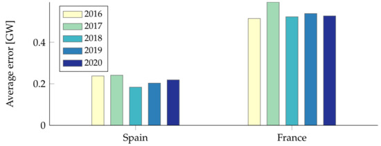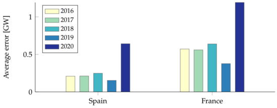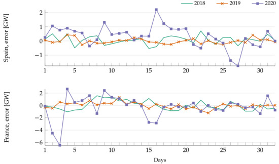 A different presentation of the same data can be seen in Figure 7, which shows the forecasting error in Spain and France between 15th March and 15th April in 2018–2020. The error is calculated as the difference between the daily average forecast and the actual load, and is presented in absolute values.